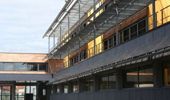 Premier lycée respectant les normes HQE dans la région Pays de la Loire, le lycée Tabarly fait 14600 m². En ossature en poteaux poutres béton, il a été habillé avec 6200 m² de murs manteaux POBI réalisés sur mesure. Inauguré en 2009, il accueille jusqu’à 350 élèves qui ont été associés au projet dès sa conception.